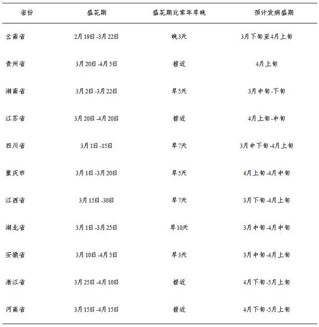 今年,長(zhǎng)江流域冬油菜種植面積為9446萬(wàn)畝,各省平均感病品種比率為65.9 %,比上年增加0.9個(gè)百分點(diǎn)。目前,云南、貴州、湖南、江西、湖北、安徽,以及浙江南部處于盛花期至花莢期,四川、重慶、江蘇、河南、陜西、上海,以及浙江北部處于始花期至盛花期,與上年同期相比,大部分地區(qū)花期比常年提早3-7天,最高提早10天,花器易感期與子囊孢子發(fā)生期相吻合時(shí)間長(zhǎng),有利于病菌侵染。預(yù)計(jì)各地花期和發(fā)病盛期見(jiàn)表2。