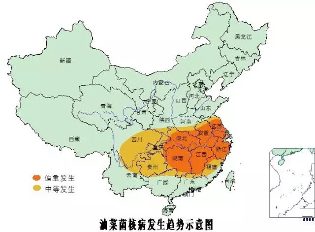 1.重發(fā)區(qū):以長(zhǎng)江流域秋播油菜產(chǎn)區(qū)湖北、湖南、安徽、江蘇、江西為菌核病重發(fā)區(qū),注意重點(diǎn)防控。